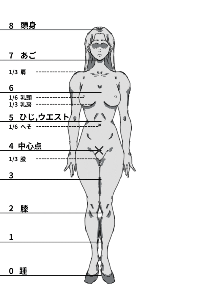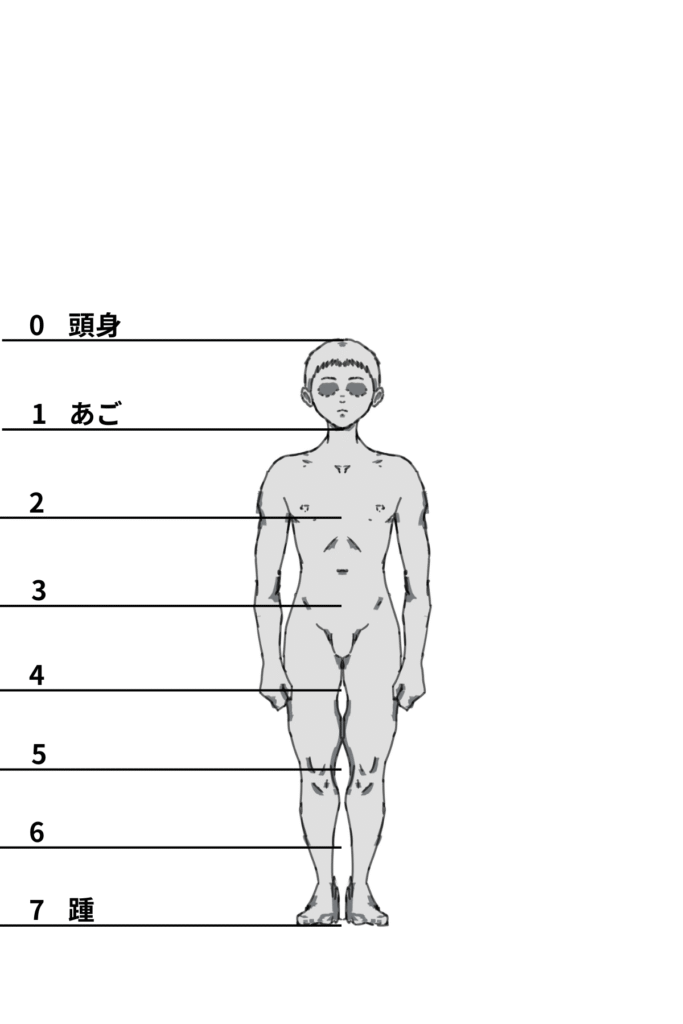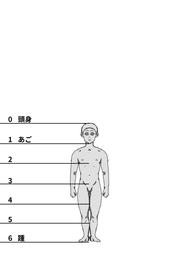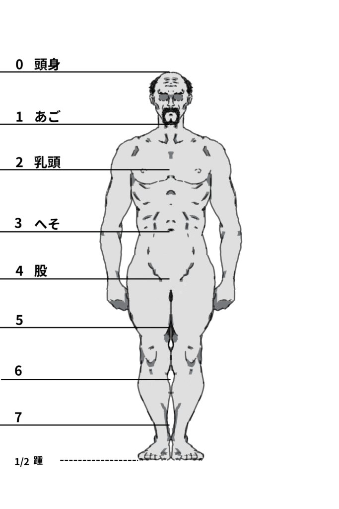 頭身が異なる場合でも、人物の中心点がどこに位置するかを把握しておくことで対応できます。基本的には股下の位置に中心点がくることが多いです。
