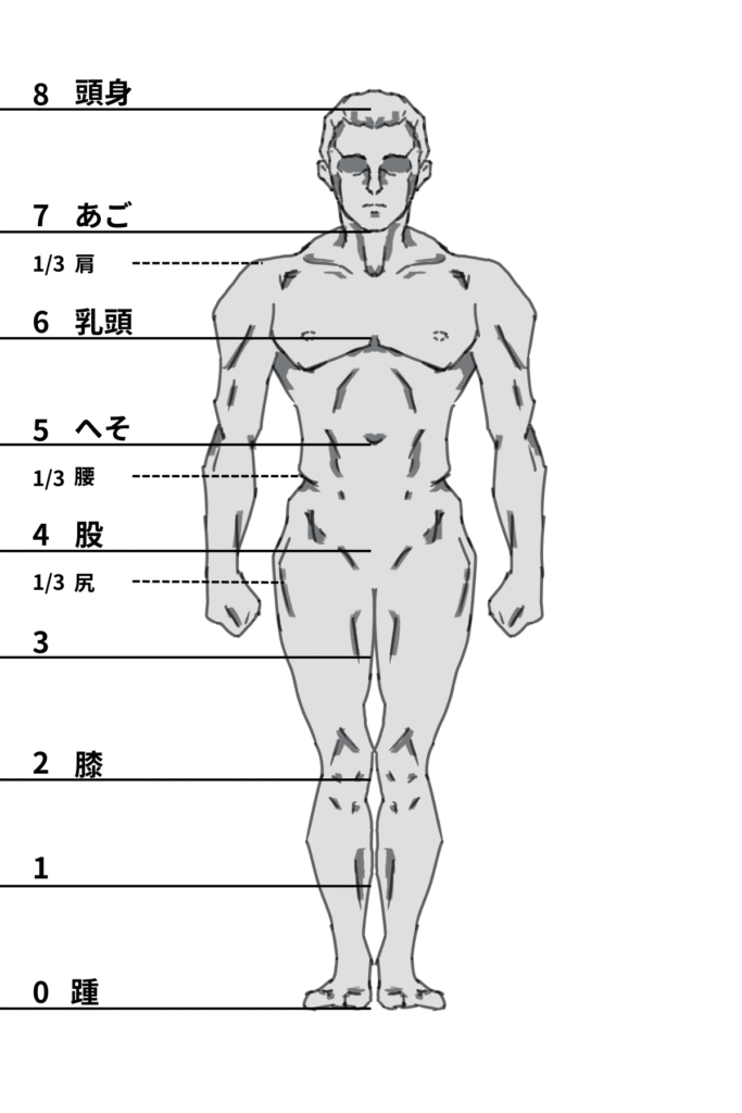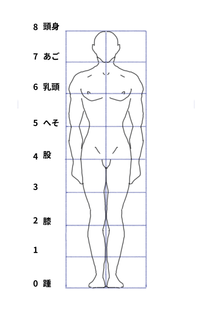 それぞれの頭身に体のどの部分がくるかわかれば、このような平面図を作成することは容易に感じます。