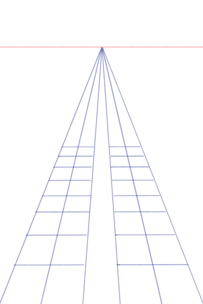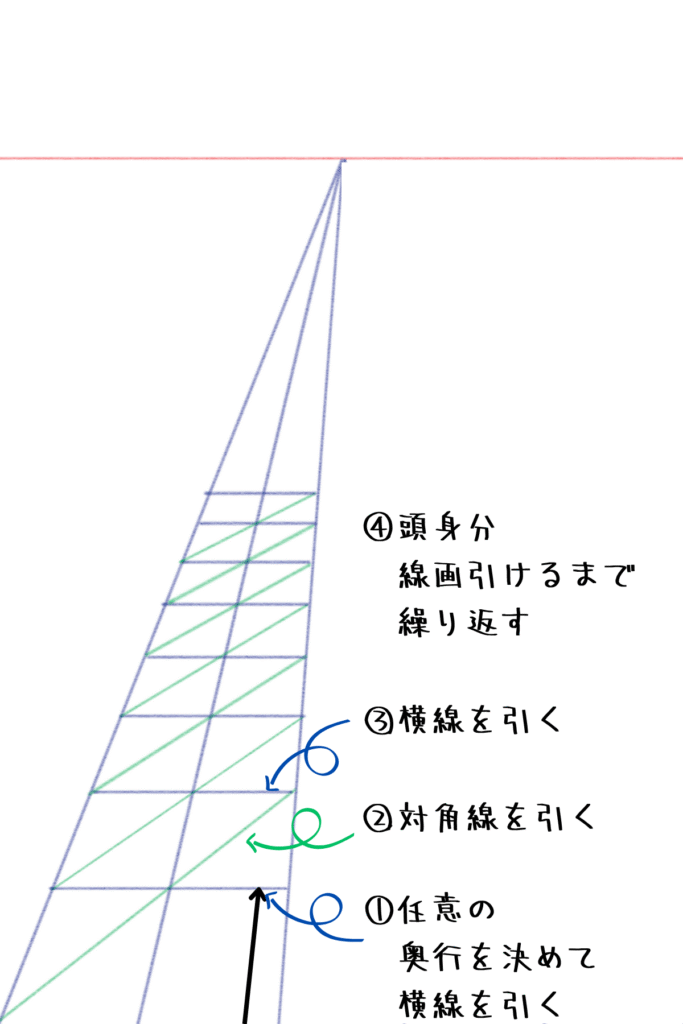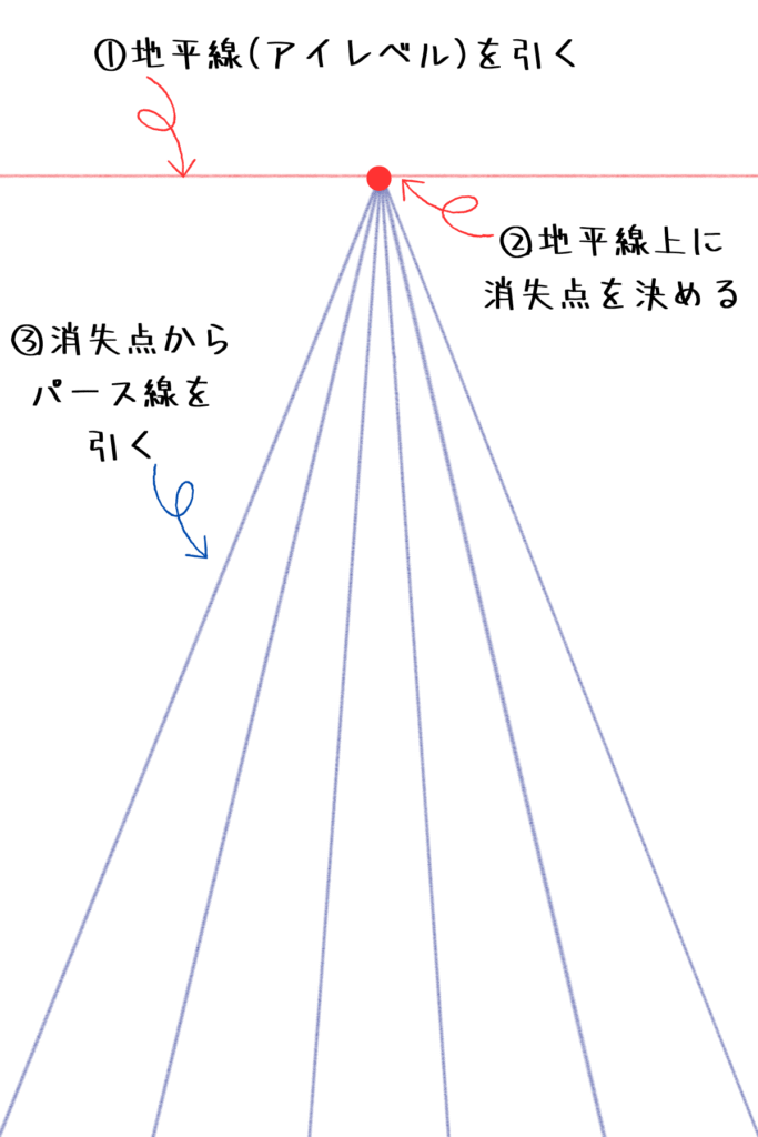 まずは目線の位置に地平線を引きます。その地平線上に消失点を決めて、そこからパース線を引きます。パース線で遠近感を表現できそうですね。