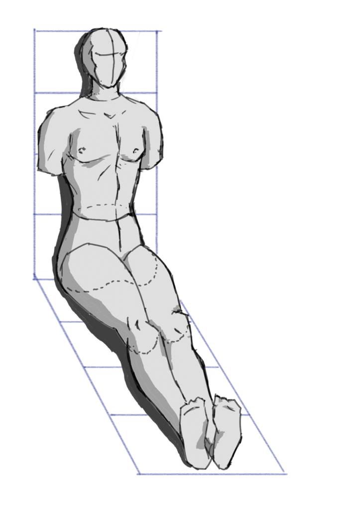 座っている場合は上図のように二つの面で捉えることで対応できます。この場合も立体としてどの位置に体の各部位が配置されるかを考えながら描画する必要がありそうですね。