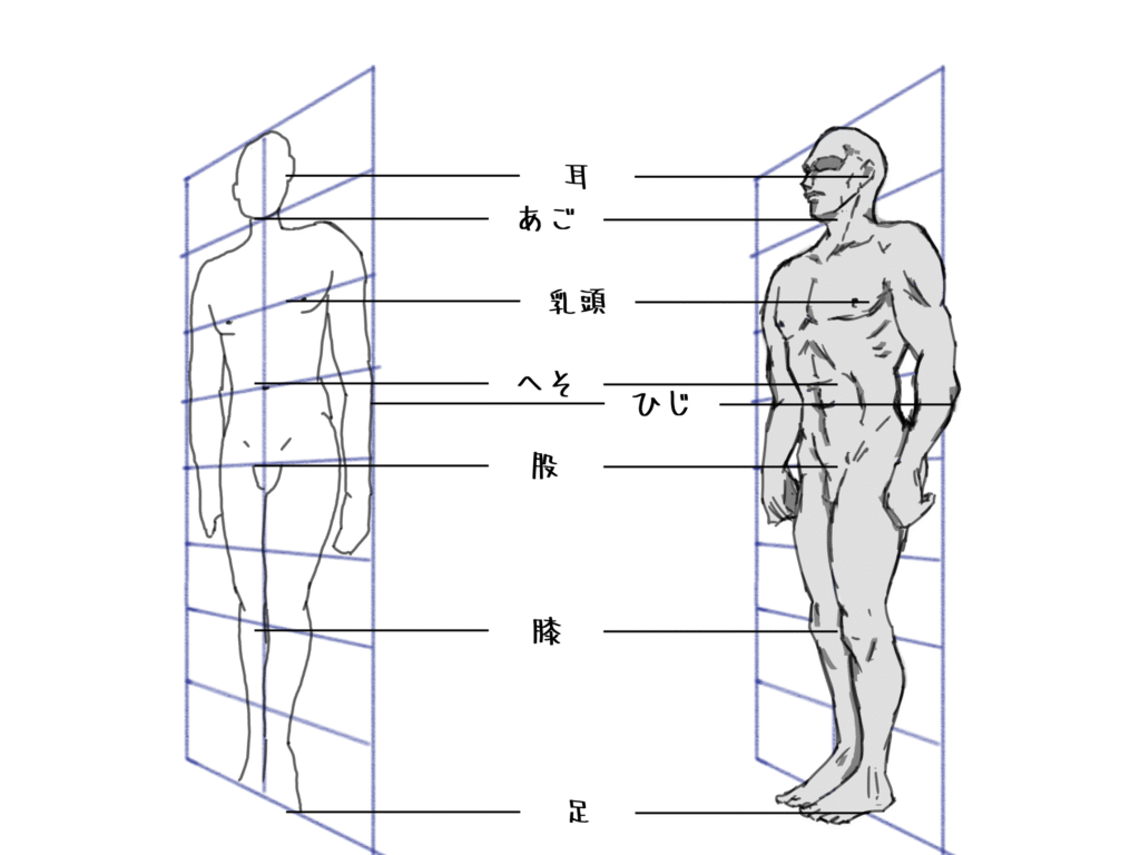 8頭身のプロポーションに合わせて、平面図表に人体のシルエットを描き込みます。そしてその平面図を「地図」のような手がかりとして、立体的に描けば完成。
