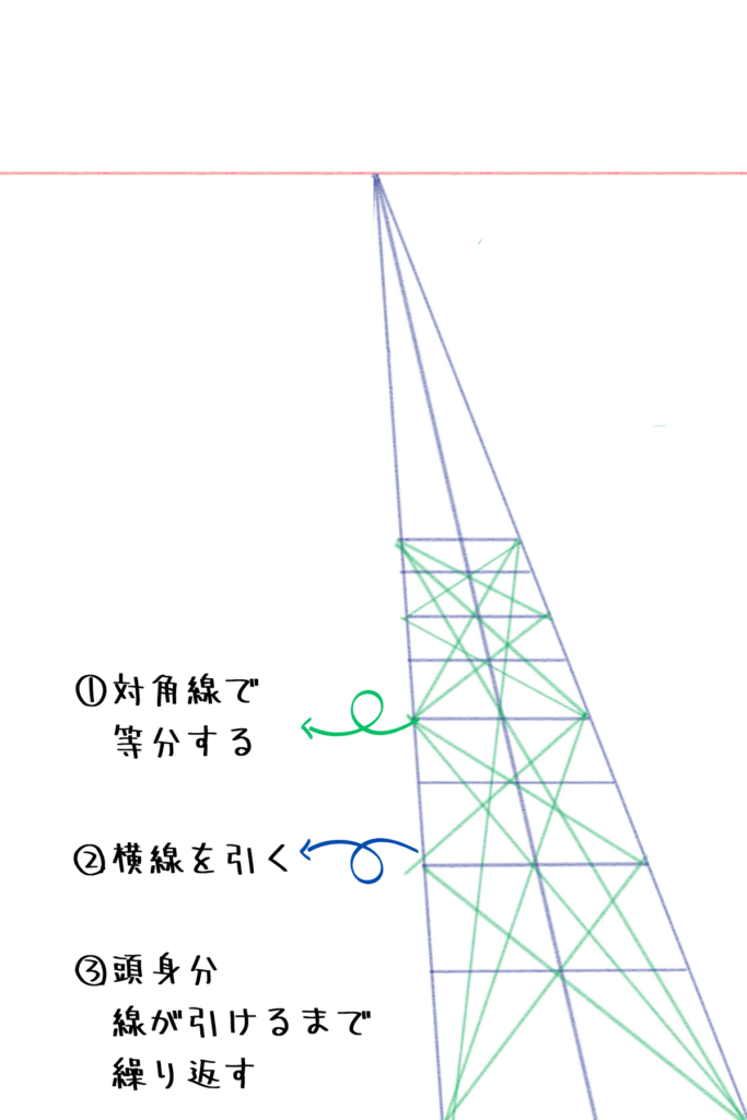 今回は8頭身なので、八つのスペースができるように分割します。2通りのやり方がありますが、どちらでの方法でも問題ありませんね。
