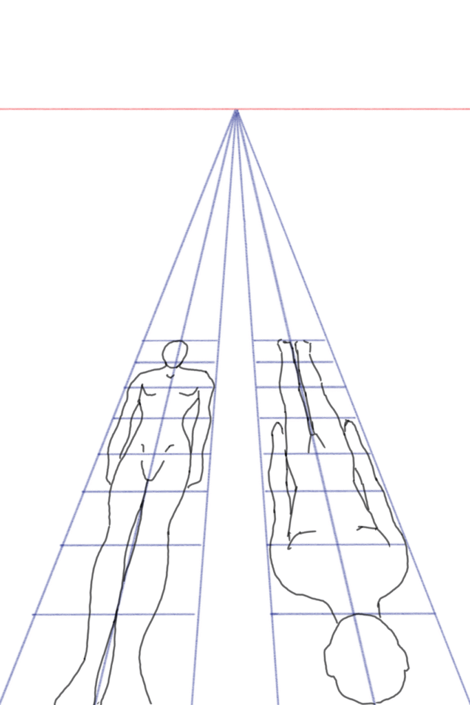 上図のように、消失点から伸びる2本の線上にある平面図表は、同じ身長になります。これをうまく利用できれば、人物を立体的に背景へ溶け込ませることもできそうです。