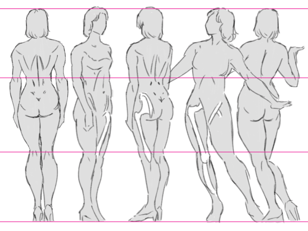 お尻の上部には二つのくぼみとV字の凹み。そして臀部のくぼみなどの細かな部分も表現したいですね。また腰の部分の骨の出っ張りは背面でも同様です。