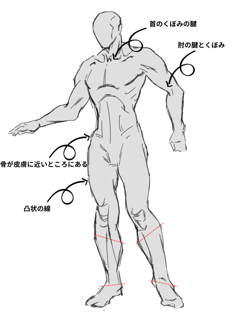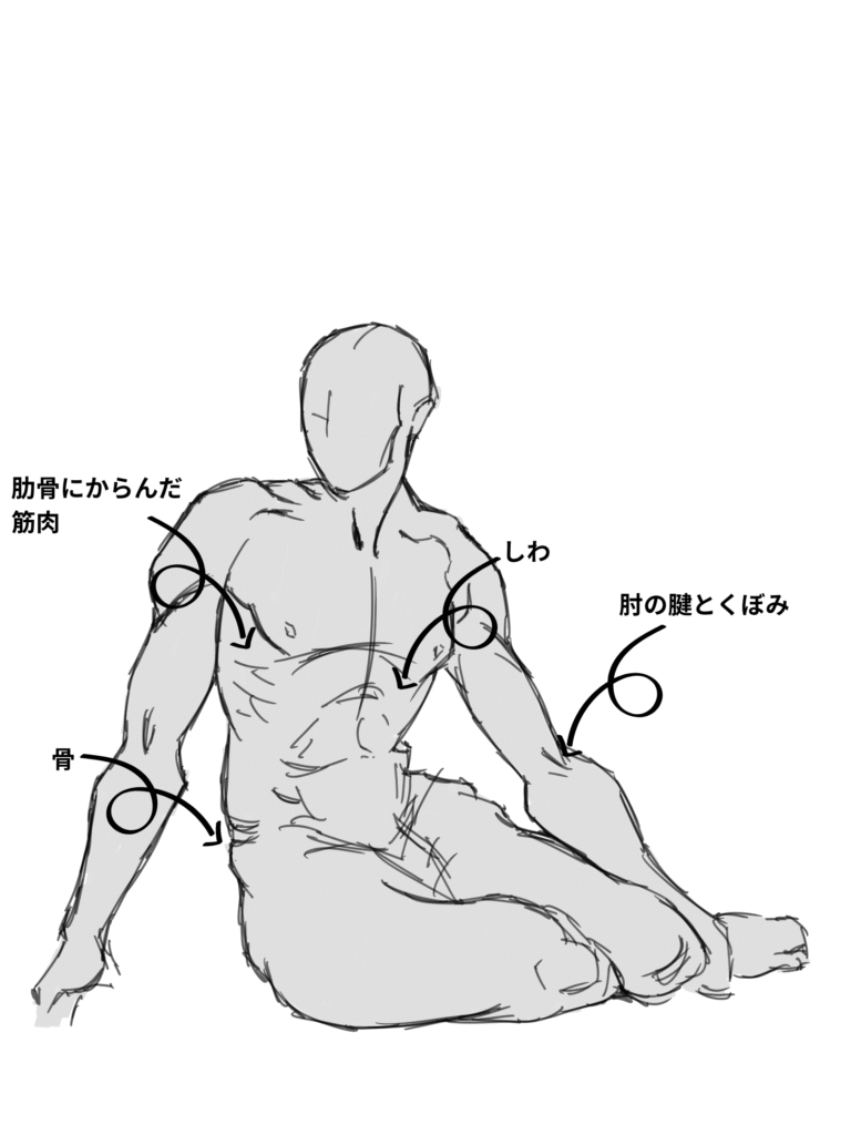 腕の部分もアウトラインが正面から見る時とは異なっており、肘の骨などは特に複雑に感じる部分。ここについては、さらに骨や筋肉について詳しく学んでいくことで、より描く際の重要なヒントとなることでしょう。