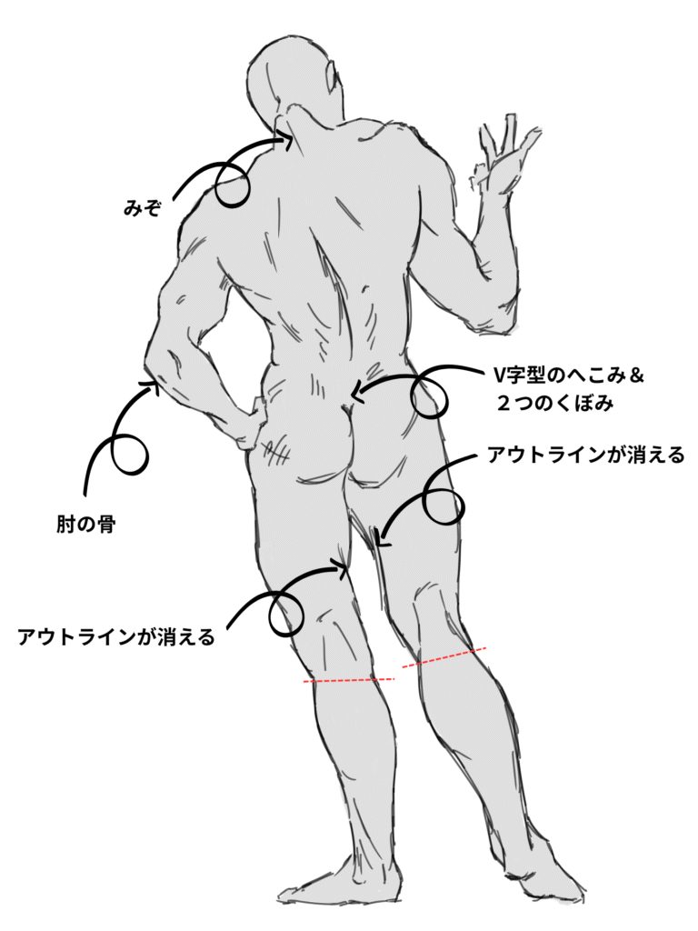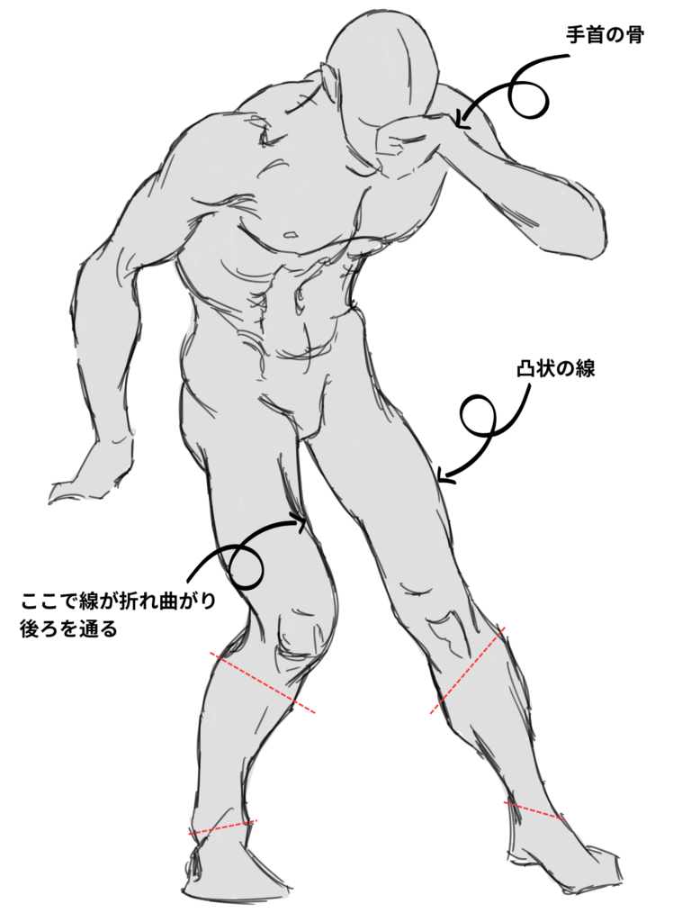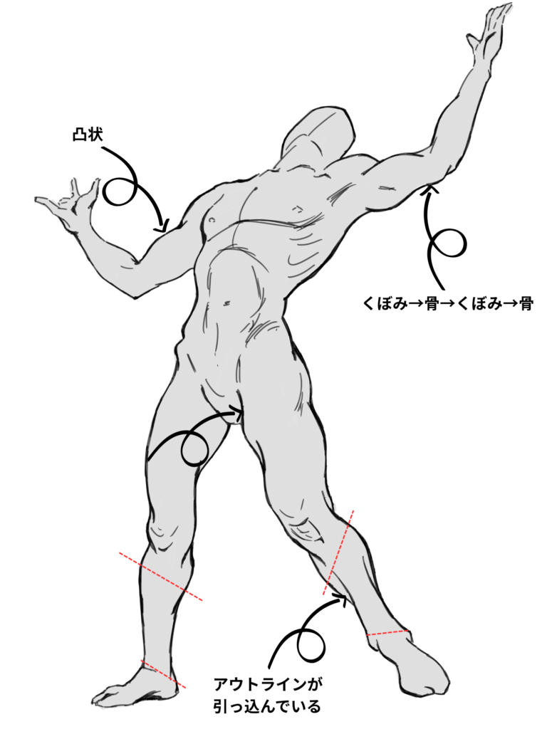 例えば脚の部分を見ると、人体の表面から見れば膝が前面に突き出ているようにアウトラインを描き、人体の背面であればふくらはぎが立体的に盛り上がっているようにアウトラインで表現するといった具合です。
