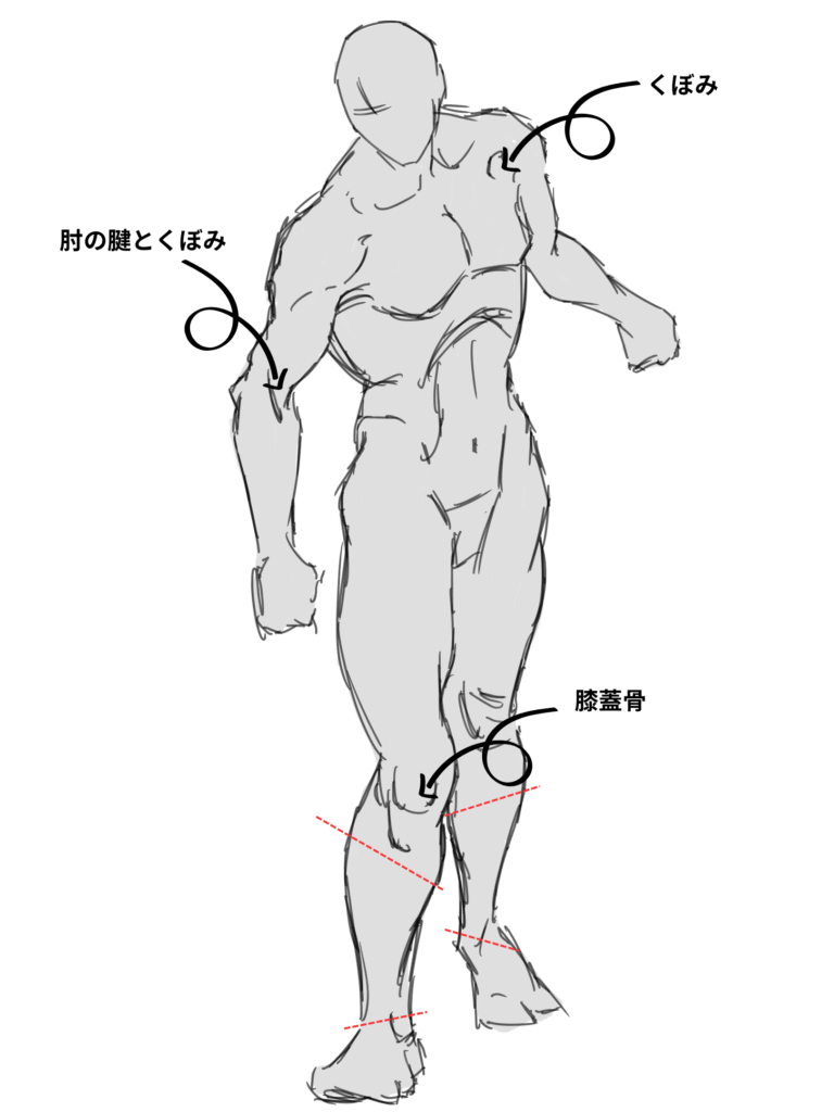 肩から腕に向かうアウトラインは、骨がある部分で少し盛り上がるように描きます。そして腕のつけ根部分となる三角筋は少しくぼんでいるのが確認できますね。