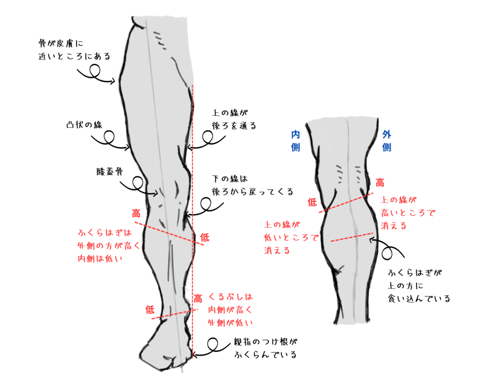 膝の下はすぐにふくらはぎが来ています。ふくらはぎは先ほど説明した通り内側が低くなります。膝の構造上そうなるといった感じでいいでしょう。そしてふくらはぎから下に伸びる線は引っ込んでいます。画像だとちょっと膨らみすぎですね…。