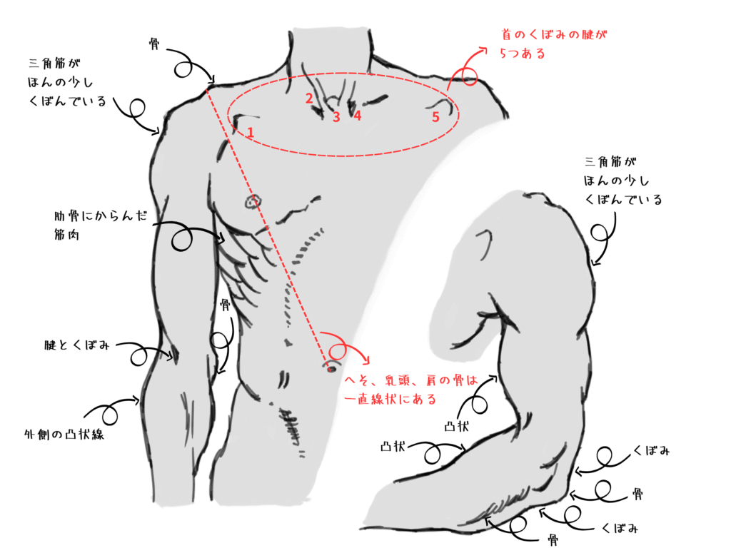 三角筋がほんの少しくぼんでいるところは押さえておきたいポイント。また腕を曲げる部分は腱があることで凹みが出る点も注目。