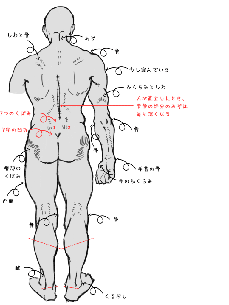 背中は背骨の部分のしわが一番面積が大きいですね。人が直立した時には、背骨の部分の溝が最も深くなる点も知っておきたいところ。